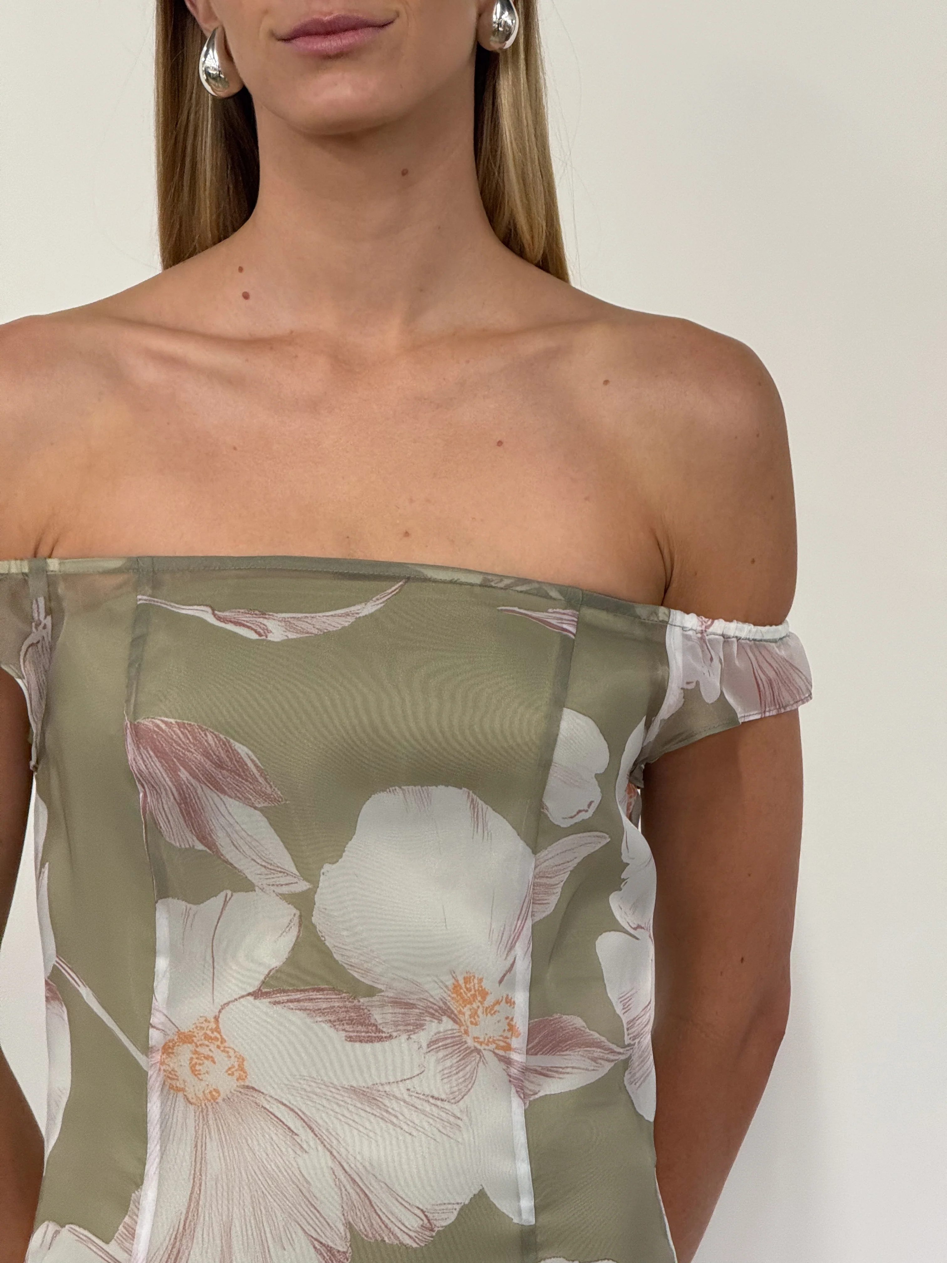 The Clementine Maxi Dress in Peppermint Floral is made of celebration. A new style to Featuring a classic off shoulder neckline is fitted through the body that falls into a voluminous skirt with body and movement.