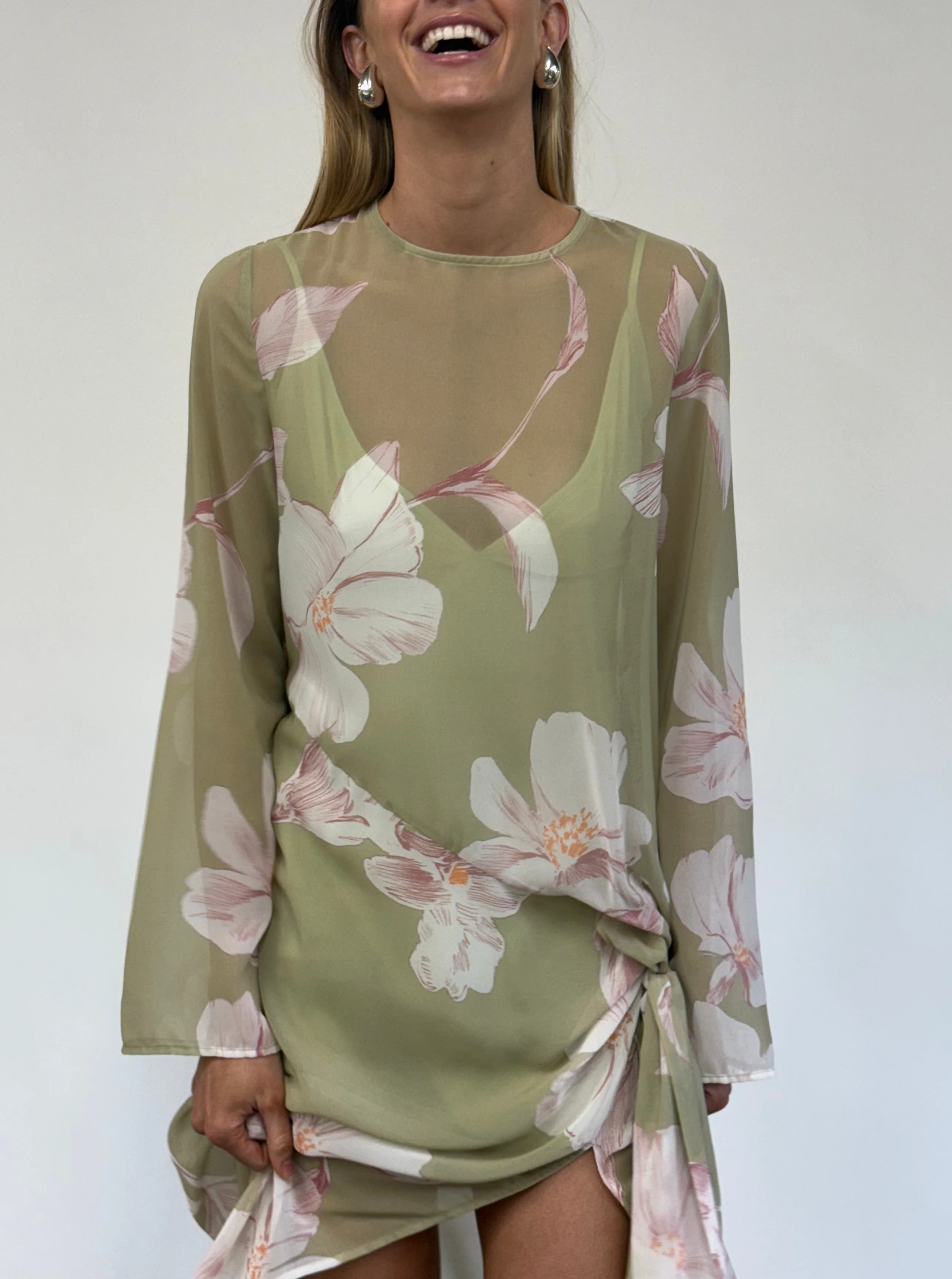 Made from a soft chiffon, this style come with an adjustable slip and tie that can be styled through the twist detail, around the neck and waist.