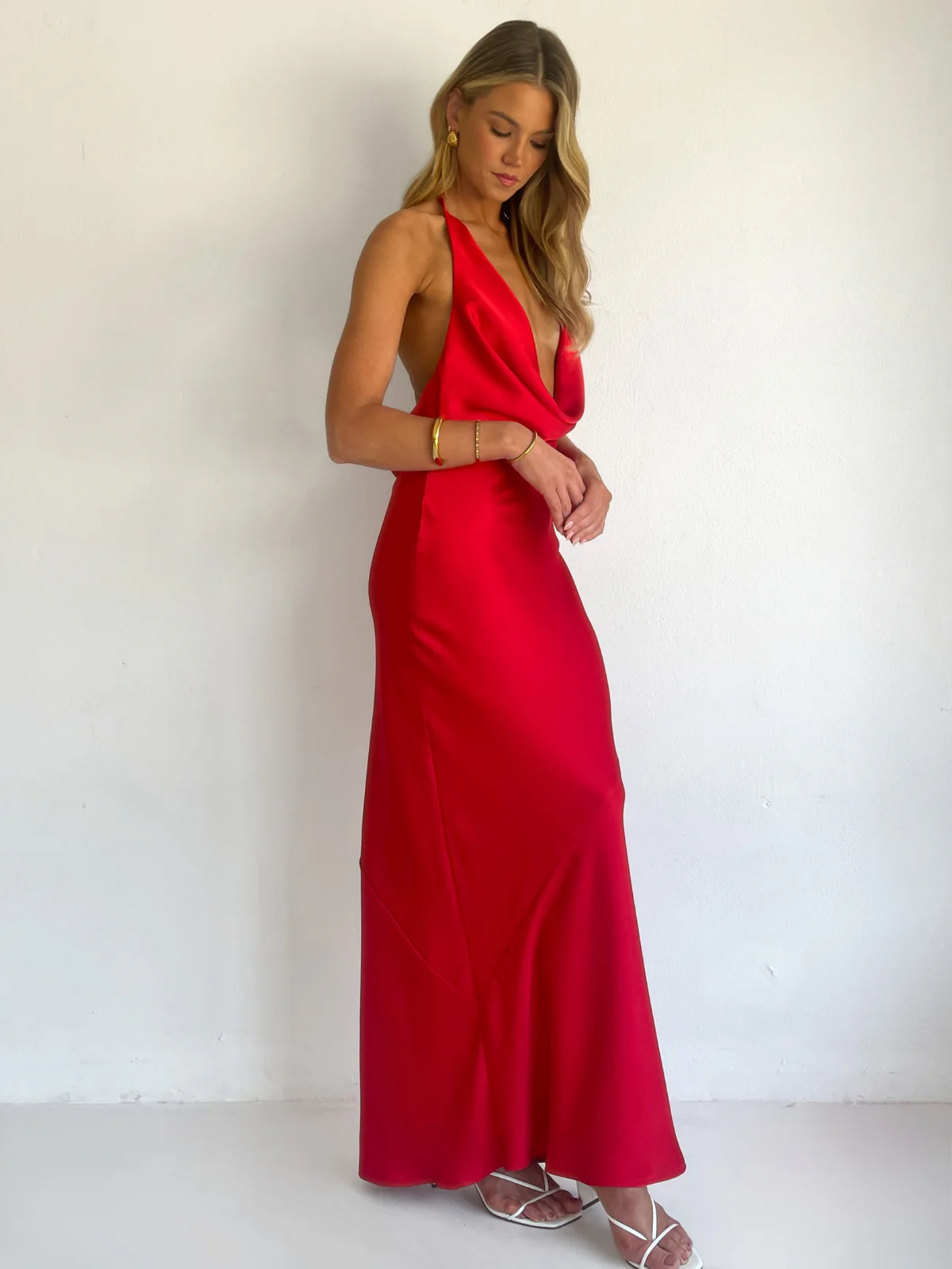 The Lucia Maxi Dress in Red features a bias-cut silhouette with a soft cowl neckline that can be styled multiple ways.