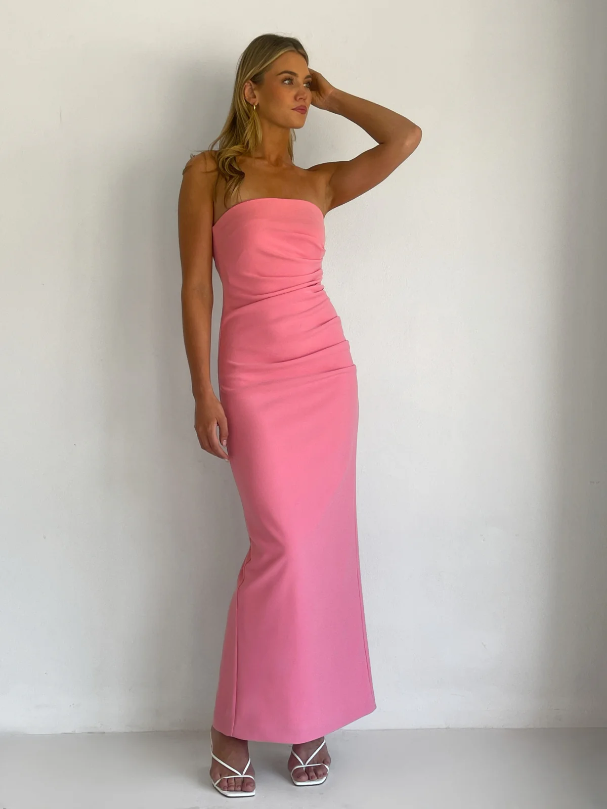 The Lucy Midi Dress in Calypso is made from a stretch bonded crepe fabrication, featuring a strapless neckline, flattering tuck detailing through the waist and is fully lined in a soft stretch jersey.