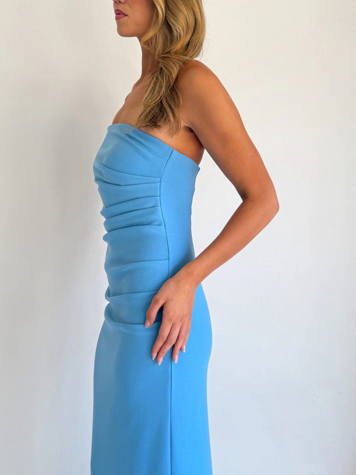 The Lucy Midi Dress in Capri is made from a stretch bonded crepe fabrication, featuring a strapless neckline, flattering tuck detailing through the waist and is fully lined in a soft stretch jersey