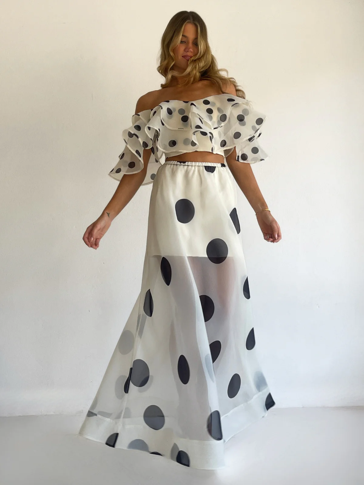 The Sibella Top in Ivory Polka from By Nicola is made from a soft organza. Designed to sit both on and off the shoulder for styling versatility.