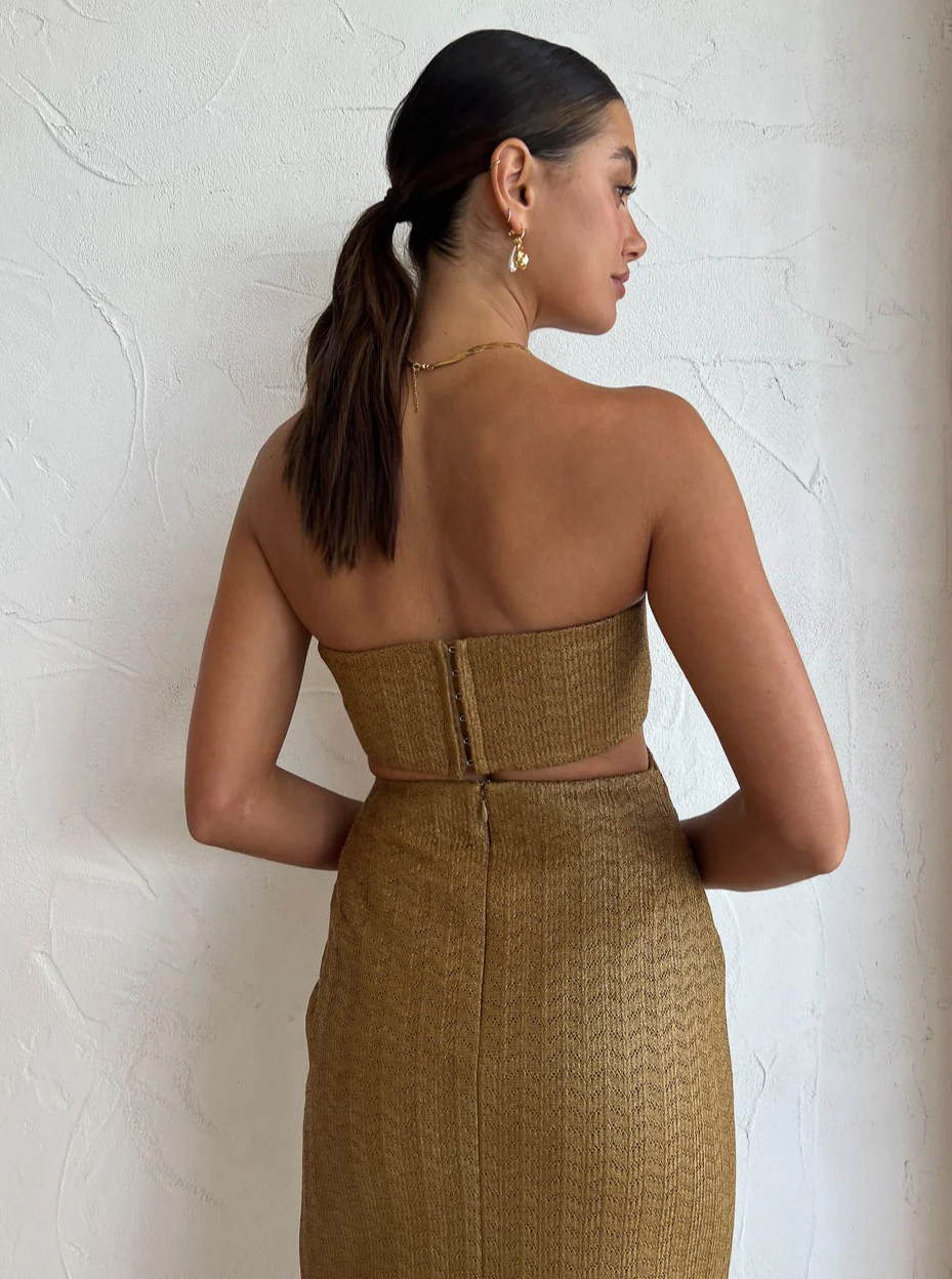 Cut from a specialty fabrication in an open herringbone weave. This strapless midi dress features a slimline silhouette, a subtle cut-out at the back along with a split at the centre back for ease of movement.