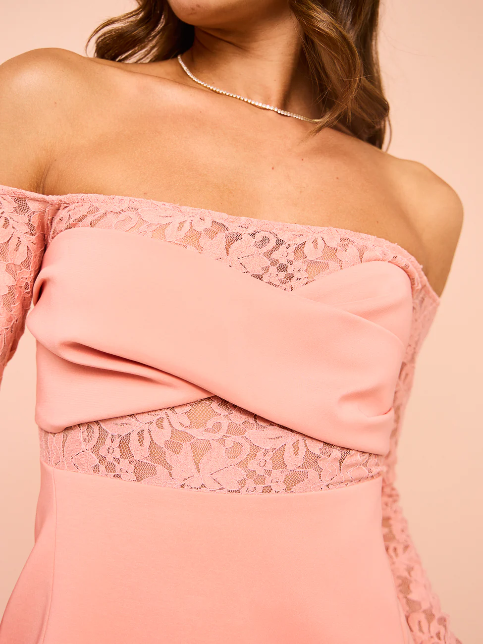 Crafted from a delicate stretch lace, this mini dress features an off the shoulder neckline and exaggerated volume skirt.